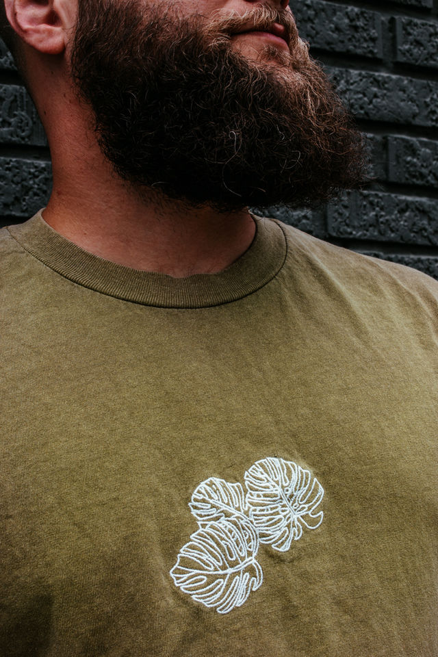 This one is for you, plant lovers. Rep your love for beer and plants with this American Apparel T-Shirt in Faded Army with white embroidered mostera leaves on the front and a white logo screenprint on the back.